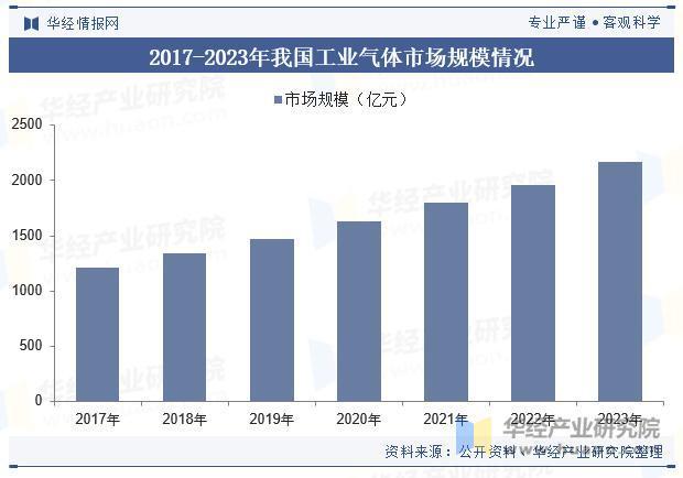 我国工业气体行业较全球工业气体行业起步较晚,但在国家政策推动、外资引入、高新技术产业发展等因素的驱动下发展迅速。随着国内工业市场快速发展,工业气体下游行业需求日益增长,从需求端刺激了我国工业气体行业的发展,为我国工业气体行业带来历史性的发展机遇,我国逐渐成为全球工业气体行业最活跃的市场之一,2017年至2023年,我国工业气体行业市场规模由1211亿元增长至2168亿元,年复合增长率为10.19%。